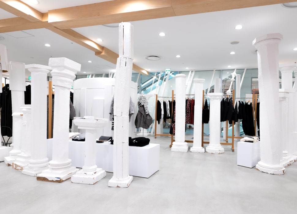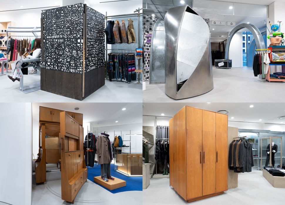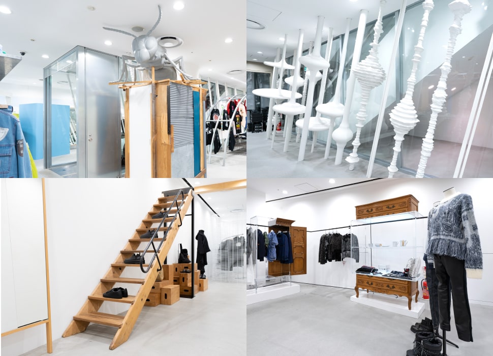 さらにドーバーがこだわっているのが、服や小物のいわゆるファッションを引き立てながらも共存する、さまざまなディスプレイ=アートピースです。たとえば、川久保玲が手がけたフィッティングルームや什器が多数あります。また、1Fにあるハット(HUT)と呼ばれる小屋は、ドーバー ストリート マーケットのシンボル的存在で、ショップのロゴにもその形状が使われています。各ブランドも思い思いのディスプレイを考え展示しており、まさにファッションとアートが融合し、ドーバー ストリート マーケットのコンセプトを実現しているのです。皆様もDover Street Market Ginzaにいらして、ぜひ『Beautiful Chaos(美しき混沌)』を体験してみてください。
