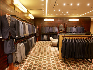 メンズフロアの最奧には、スーツやジャケットなどビジネスウェアがラインナップ。豊富な生地見本からのオーダーも承ります。
