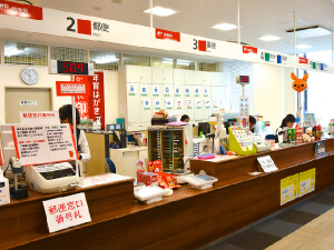 営業時間は郵便窓口が10:00-18:00、貯金窓口と保険窓口は17:00までです。お問い合わせは03-3572-9988。